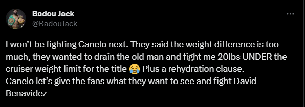 „Nem fogok legközelebb Canelo ellen bokszolni. Azt mondták, hogy a súlykülönbség túl sok, azt akarták, hogy lejjebb menjek és 20lbs-al (körülbelül 9 kilóval) a cirkálósúlyú limit alatt harcoljunk a címért, amiben lett volna még egy rehidratációs záradék. Canelo adjuk meg a szurkolóknak, amit látni akarnak, és bokszolj David Benavidezzel.”
