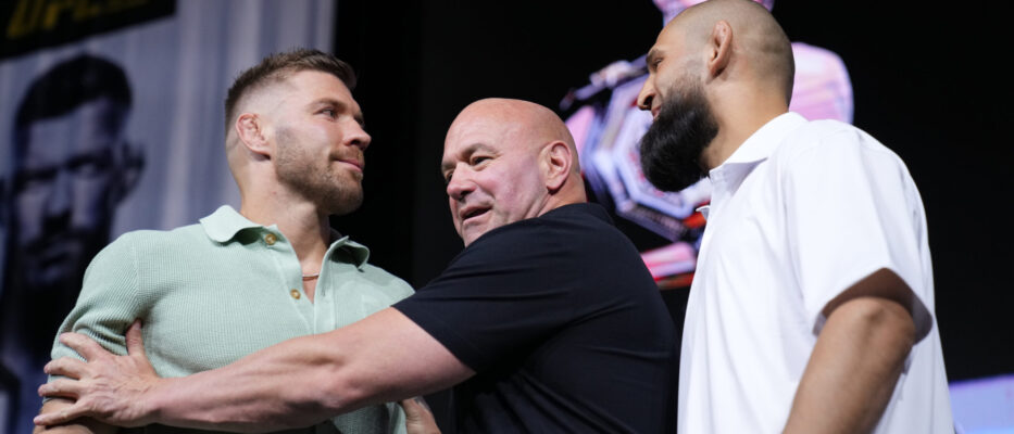 CHICAGO, ILLINOIS - AUGUST 14: (L-R) Opponents Dricus Du Plessis of South Africa and Khamzat Chimaev of Russia face off during the UFC 319 press conference at Radius Chicago on August 14, 2025 in Chicago, Illinois. (Photo by Mike Roach/Zuffa LLC)